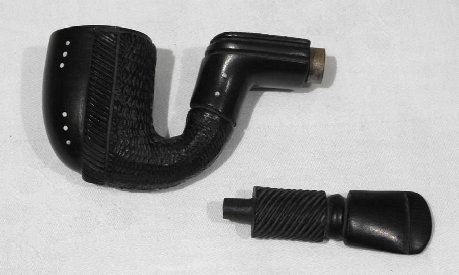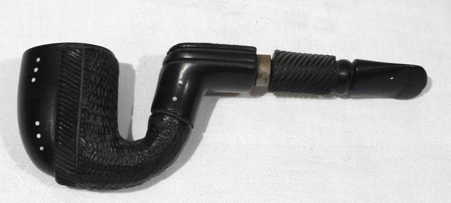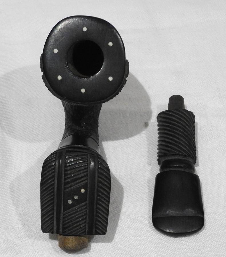 This is a vintage hand-carved tobacco pipe, believed to be of African origin, featuring a boldly rusticated surface and distinctive decorative inlays. The pipe has a bent shank and stem with an angular design, giving it a strong, sculptural presence.