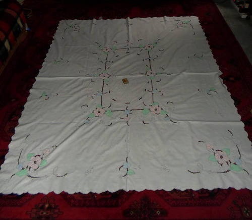 BEAUTIFUL MEDIUM TO LARGE VINTAGE COTTON TABLE CLOTH WITH CUT OUT SECTIONS REVEALING PATTERNED HAND EMBROIDED APPLIQUE TYPE DESIGNS. SEVEN NAPKINS COME WITH THIS CLOTH.