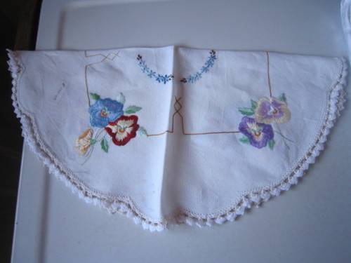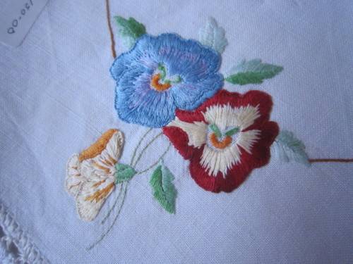 Lovely vintage hand embroidered tray cloth with beautiful edging, there are a few very small holes due to old age, but this item is brilliantly hand done.44cms across middle, postage 55.00.