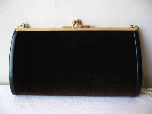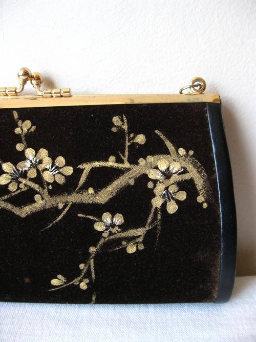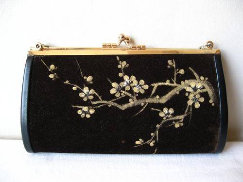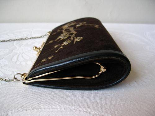 Authentic vintage bag made from a suede like fabric with hand painted floral design on front and gold tone chain. Very good condition. Frame is slightly asymmetrical, but does not affect the opening and closing of the bag. 22.5 cm x 12.5 cm x 4 cm. Chain strap measures 100 cm long.