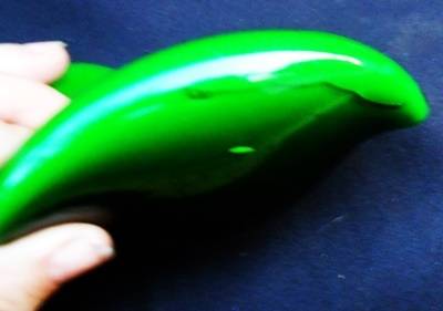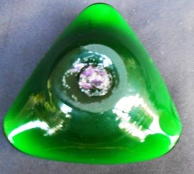 This beautiful heavy collectable ashtray in emerald green and white glass has a crack mark in the green glass. the crack can not be felt and it is not very visible. The spot beneath the dark crack? line is an air bubble in the glass.