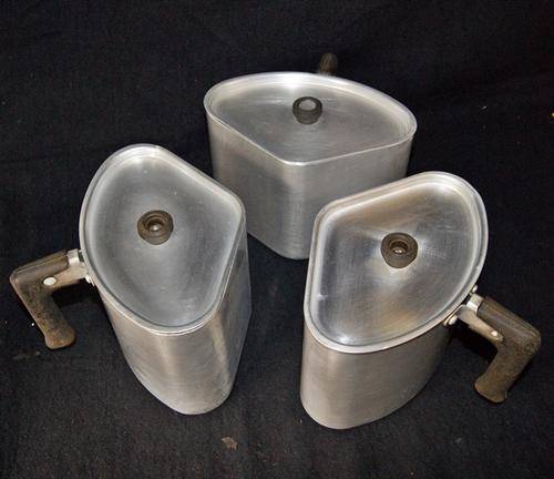 A VINTAGE SET OF 3 HART ALUMINIUM TRIANGULAR POTS WITH LIDS