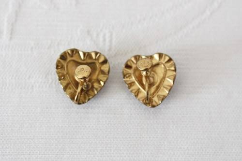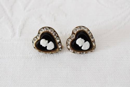 VINTAGE HEART CAMEO BLACK WHITE RHINESTONE SCREW EARRINGS