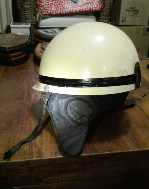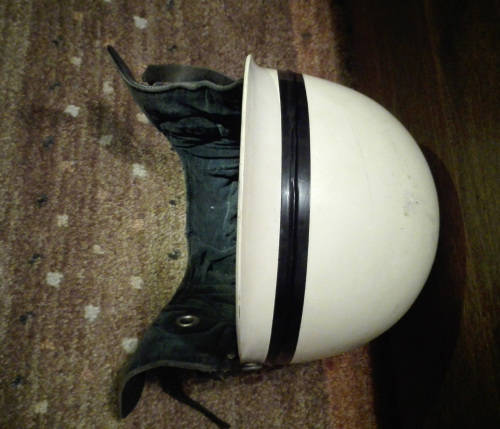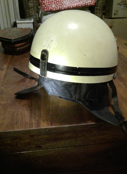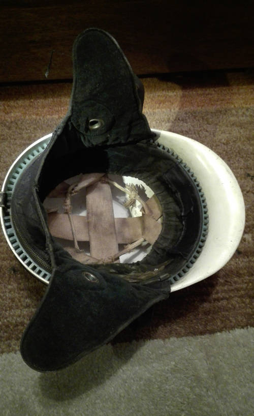 THE HELMET HAS A LEATHER INNER AND IN GOOD CONDITION CONSIDERING ITS AGE.NOT SURE WHERE IT WAS USED, EITHER FOR MOTORING OR AN OLD MOTORBIKE HELMET.