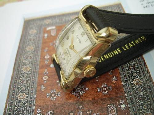 THIS HIGHLY SOUGHT AFTER WATCH IS A VERY COOL EARLY 1950's VINTAGE BENRUS KNOWN AS THE "PRINCE HUGO" MODEL. ITS 10KT.GOLD FILLED ORNATE ART DECO CURVEX TANQ STYLE CASING WITH WILD HEAVY FLARED LUGS, MEASURES 28MM X 37MM INCLUDING CROWN AND LUGS.