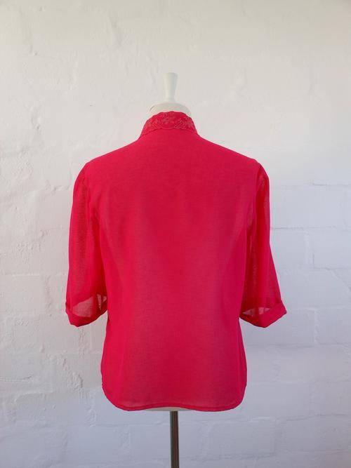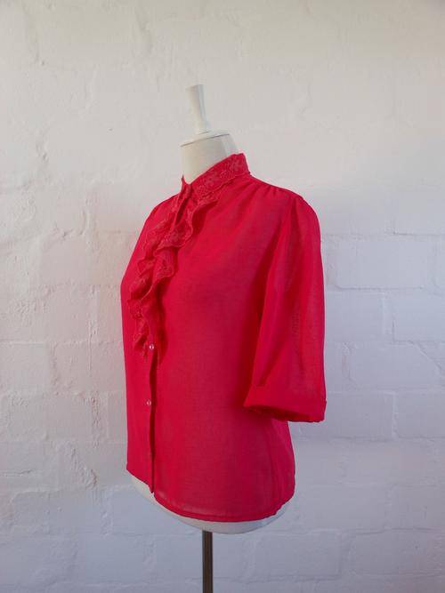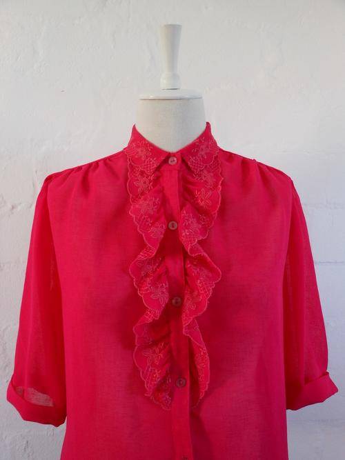 VINTAGE HOT PINK EMBROIDERED RUFFLE FRONT SHIRT BLOUSE TOP - SIZE 10