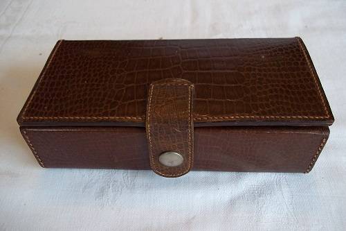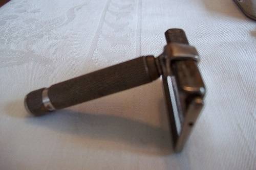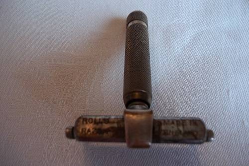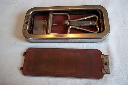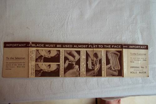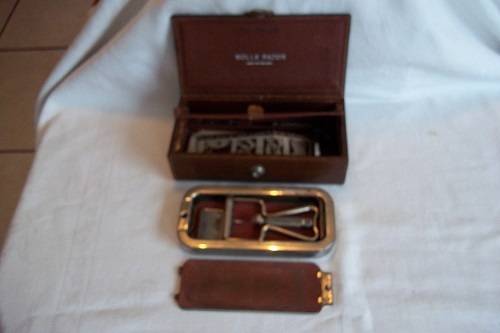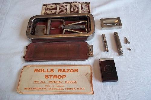 Vintage Imperial No. 3 Rolls Razor in a leather travel case - 1927. This is the super model of the Rolls Razor, with a two layered leather case. In the top layer, is the metal box which holds all the razor parts. The box is marked "Rolls Razor, (1927) Ltd, Patented in England and abroad, English Patents Numbers 108531, 184514, 184515, 184754, 224578, 242717, 242718 and Pending, Made in England". The second layer consists of an additional strop (still in wrapping), 2 x additional blades (1 still in wrapping), an additional handle, an additional roller and pin and the original user instructions. The kit is complete and in very good condition for its age. A great buy!