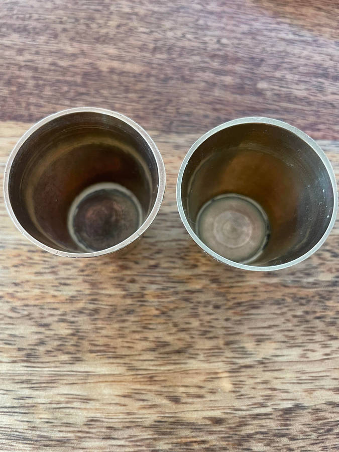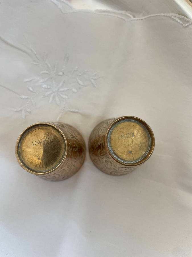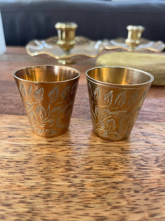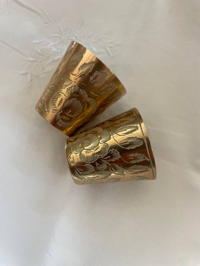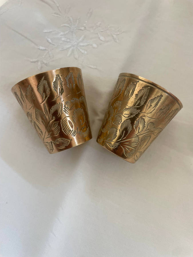 Vintage Indian Hand-Engraved Etched Leaf Pattern Solid Brass Metal Lassi Cup marked India.