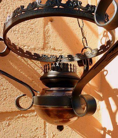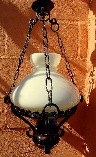 IRON LAMP ON CHAINS WITH GLASS SHADE.