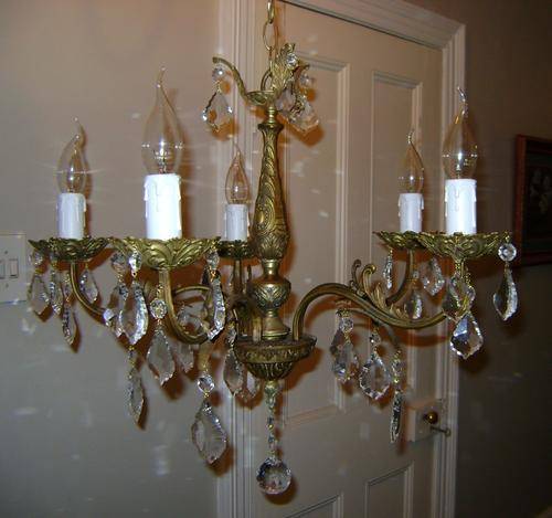 Vintage Italian solid brass and crystal chandelier with five lights. Good condition, all crystals there and wiring good. Hangs 80cm (adjustable with chain) by 55cm wide. This can be posted anywhere in SA with insurance and tracking for R100. Collection in Cape Town always welcome