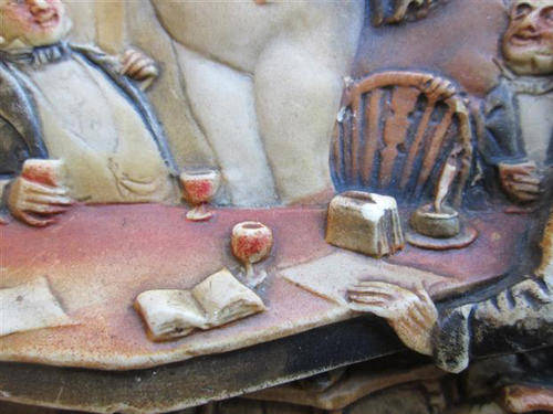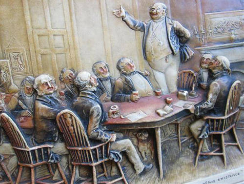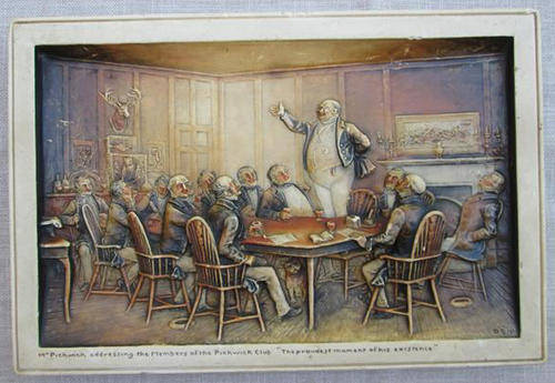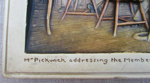 VINTAGE IVOREX WALL HANGING OF DICKENS MR PICKWICK ADDRESSING THE MEMBERS OF THE PICKWICK CLUB......" THE PROUDEST MOMENT OF HIS EXISTENCE ".... THIS IS A HIGHLY DECORATED, 3D IMAGE CAST IN PLASTER OF PARIS. THE ORIGINAL WAS A HAND CARVED CLAY DESIGN COPIED FROM PICTURE POSTCARDS. THE PLASTER OF PARIS MOLDS WERE THEN SKILFULLY HANDPAINTED AND FINALLY DIPPED INTO HOT PARAFFIN WAX TO GIVE THEM THEIR DISTINCTIVE "IVORY" FINISH WHICH WAS THEN BUFFED UP TO GIVE THE PICTURE A DULL SHEEN. SUBJECTS INCLUDED HISTORICAL PLACES OF INTEREST FROM THE U.K. AND OVERSEAS AND A RANGE OF SCENES FROM DICKENS, FAMOUS PEOPLE AND WELL KNOWN TOURIST DESTINATIONS. IN A GOOD VINTAGE CONDITION, LENGTH 31cm, WIDTH 20.7cm.