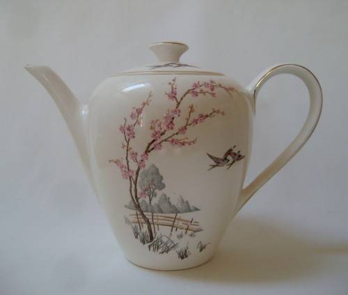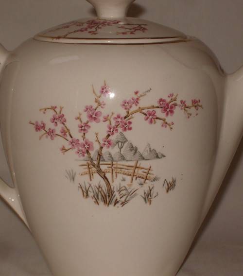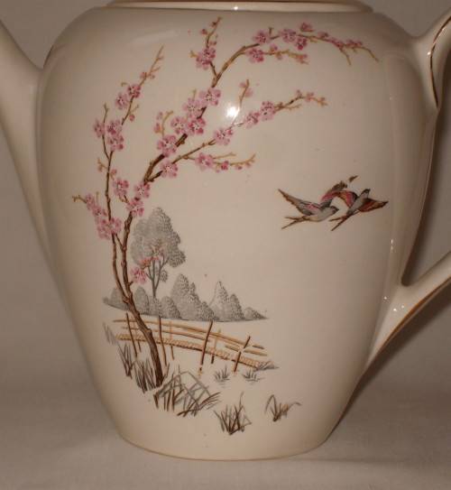 Japonaiserie scenes featuring trees with pink blossoms, mountains, wooden bridges and swallows.