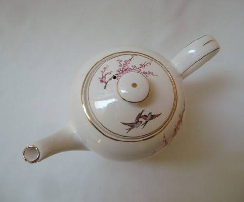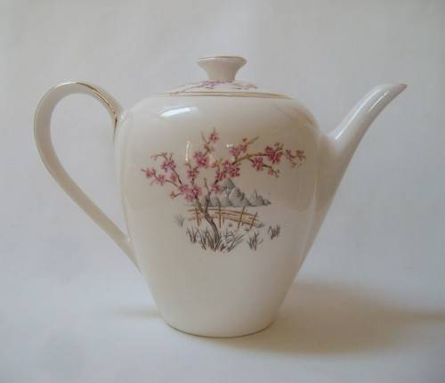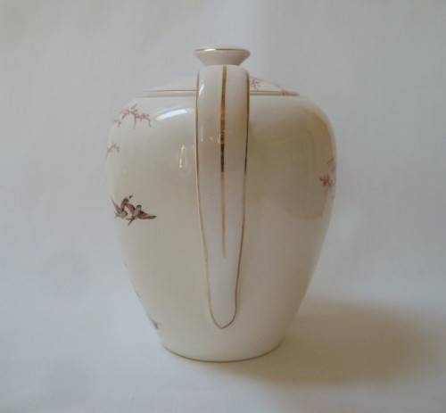 An off-white glazed china coffee pot and cover, decorated with polychrome transfer-printed