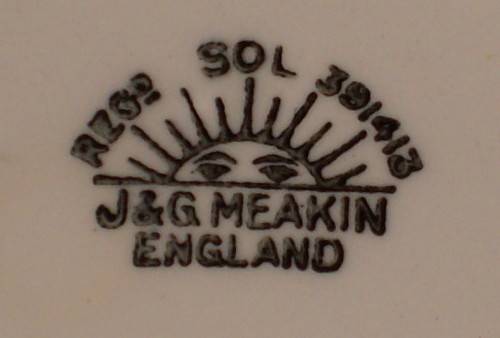 Regd. SOL 391413, Rising Sun Face, J. & G. Meakin and England, mark registered in 1912.