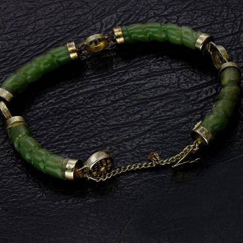 This bracelet is made of carved pieces of pale green stone -- looks like jade.