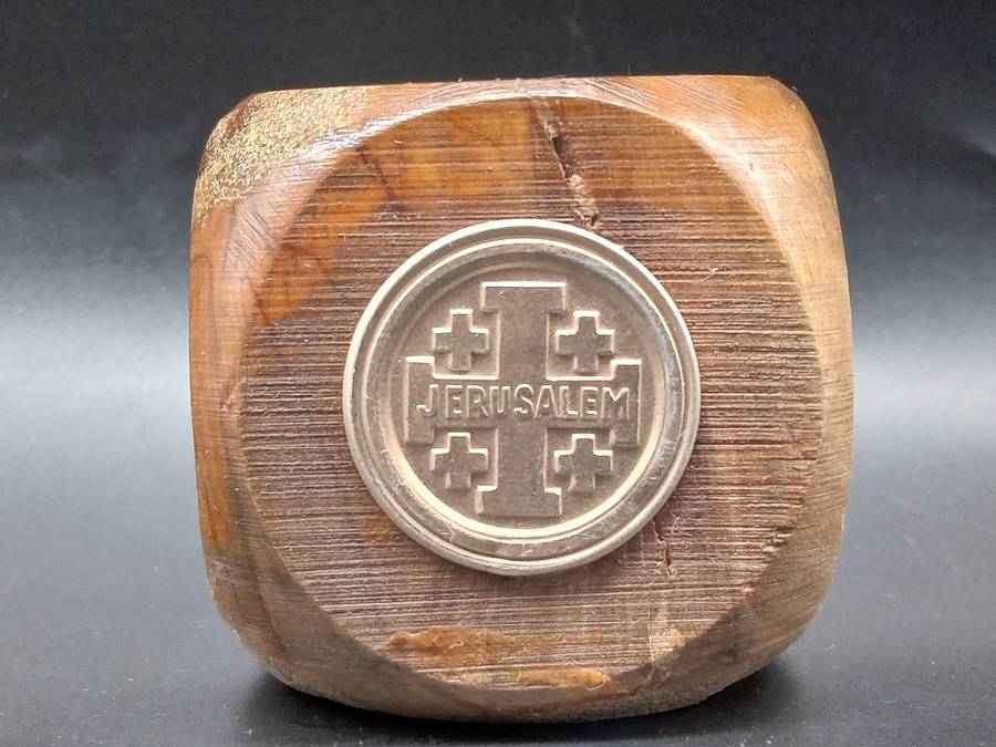 This vintage pen and pencil holder is a unique addition to any Judaica collection. Crafted from olive wood and copper, it features a beautiful design that showcases the rich history Jerusalem. The holder is handmade, adding a touch of personalization to your writing experience. Vintage Olive wood pencil holder with Jerusalem themed medallions on 4 sides. Great condition. circa 1950's