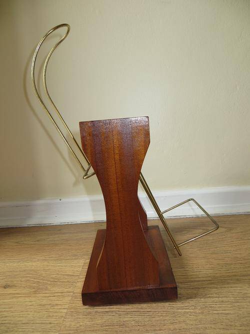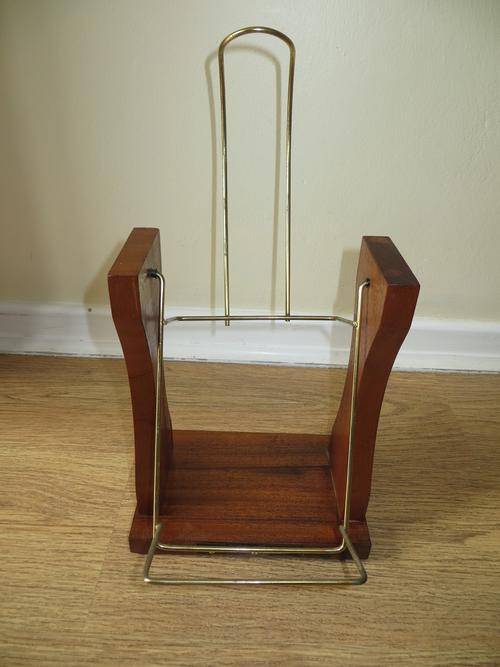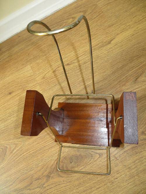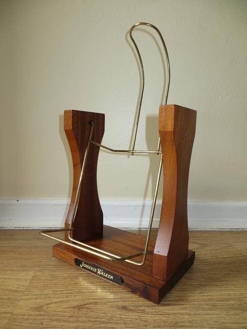 VINTAGE JOHNNIE WALKER WOODEN & BRASS SWINGING POUR CRADLE/HOLDER, SOLID WOOD BASE AND SIDES WITH JOHNNIE WALKER NAMEPLATE/ METAL HOLDING RACK.