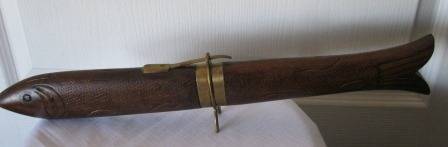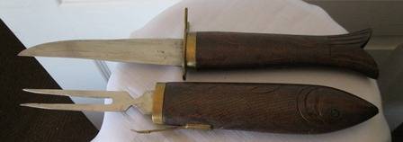 You are bidding on a Vintage Knife & Fork Carving Set Fish Shaped Central Holder is footed with brass feet and has brass locks on either side that snap in, the wood is carved teak the fish measures 43cm long x 6cm and the knife 40cm blade19cm fork 38cm long in good condition!!