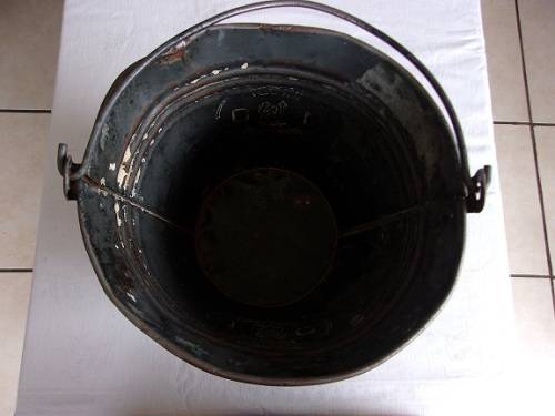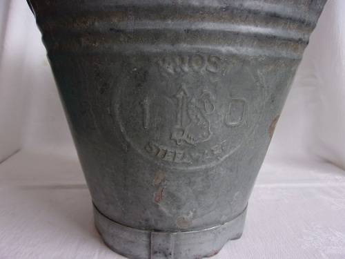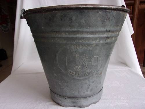 Vintage Krost Steelware 1 gallon bucket. I would estimate that this old bucket dates to the 1950s. It is made from galvanised steel, and has the Krost marking embossed on the front and back. It measures 24cm (h) x 25cm (diameter). The bucket is old and has some dings and wear, but no holes - dings add to the character. Would make a lovely feature in any vintage kitchen.