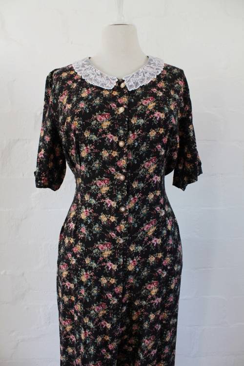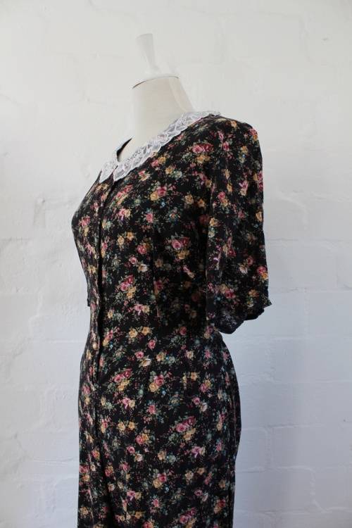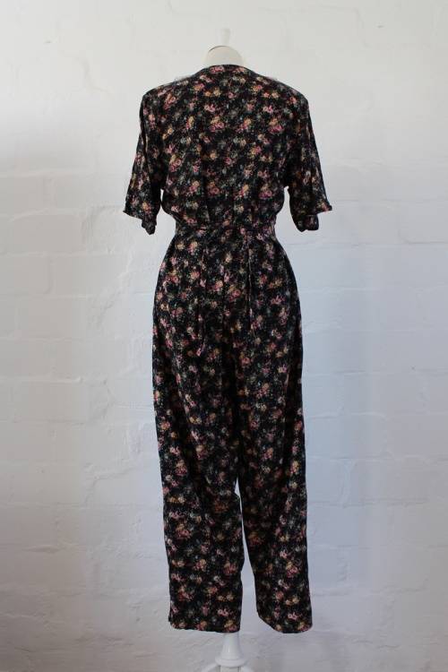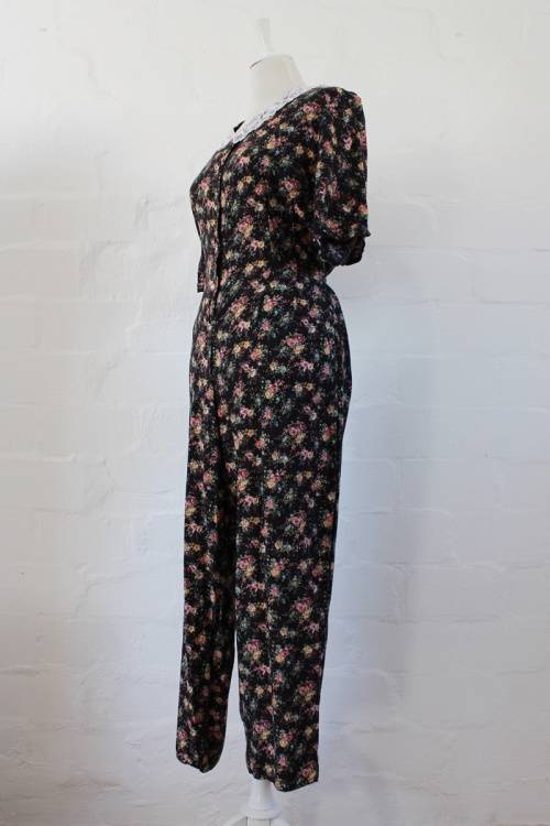 VINTAGE LACE COLLAR BLACK FLORAL PRINT JUMPSUIT CATSUIT - SIZE 14