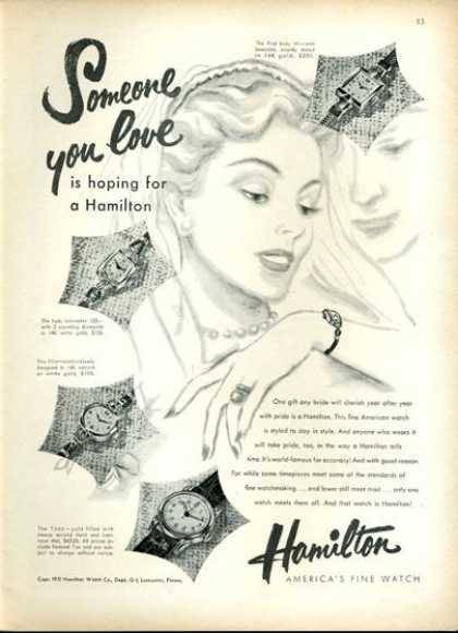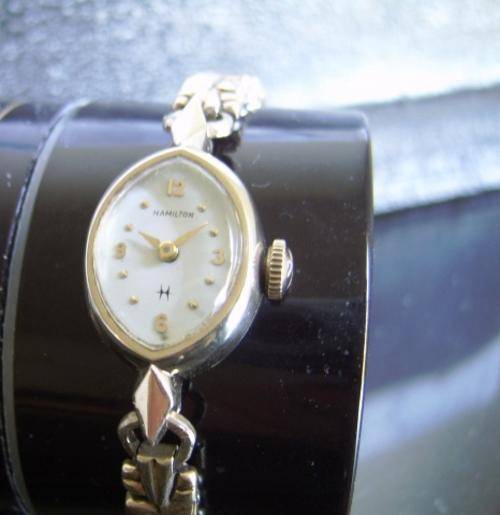 THIS SPLENDID LADIES ALL AMERICAN MADE 5 TIMES SIGNED HAMILTON WATCH FROM THE 40'S- 50'S ERA IN ITS PEAR SHAPED 10KT. RGP CASING MEASURING 15MM BY 18MM EXCLUDING CROWN AND LUGS. IS IN AMAZING CONDITION FOR ITS AGE AND WAS PROBABLY ONLY USED ON SPECIAL OCCASIONS. ITS 17 JEWELED CALIBRE 780 VERY CLEAN, HIGH QUALITY MOVEMENT IS SOMETHING TO BE ADMIRED FOR ITS CRAFTSMANSHIP THIS DETAIL TO QUALITY AND TECHNICAL ABILITY IS WHAT MADE HAMILTON SUCH A HIGHLY REGARDED AND RESPECTED COMPANY. THIS WATCH COMES ON A QUALITY GLEN AMERICAN MADE EXPANDABLE TYPE STRAP X WHICH MIGHT NOT BE THE ORIGINAL BUT CERTAINLY MATCHES THIS WATCH. THIS LITTLE TREASURE WILL CERTAINLY COMPLIMENT A LADY WHO LOVES THE NOSTALGIA OF DAYS LONG GONE. VINTAGE 1951 AD.