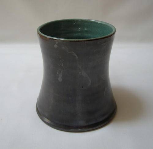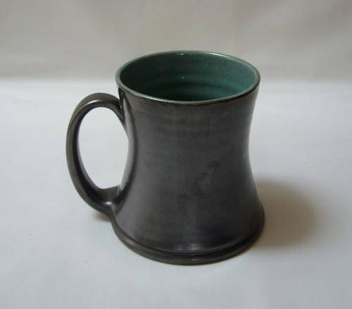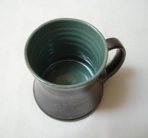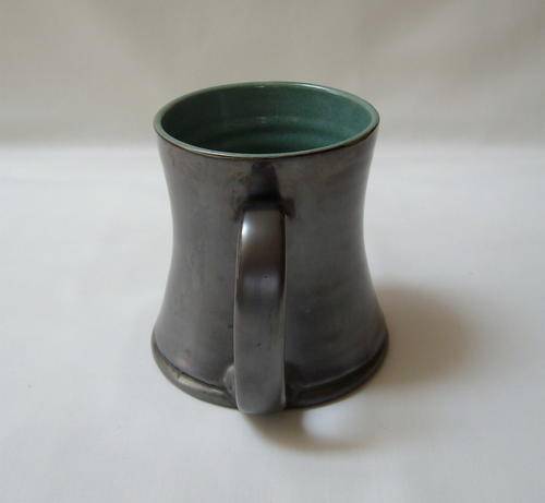 A metallic grey and mottled green glazed ceramic mug.