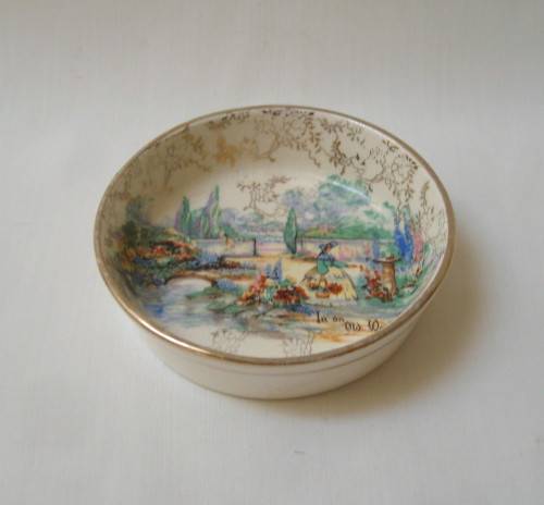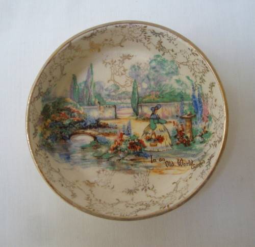 transfer-printed scene of a crinoline lady in a country garden.