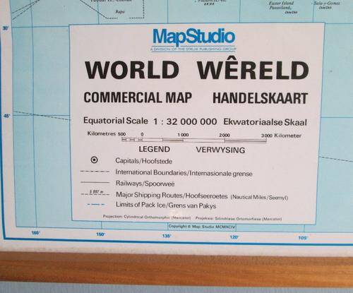Description : politically clolured map of the world at a scale of 1 : 32 000 000 showing capital and major cities, sea routes, major airports and time zones, major shipping routes with distances, major national driving routes, ocean and sea names, major mountains, deserts, rivers, world time zones, latitudes and longitudes in English and Afrikaans.