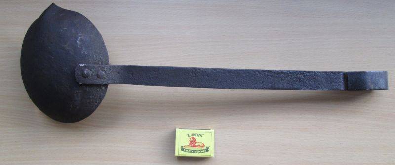 LARGE old iron melting spoon for pouring cast lead bullets. Vintage uncertain but looks as if it belongs on an ox wagon trekking up from the Cape..! Length is 500mm x 160mm. A stunning display piece. Tracked postage is R50.00.