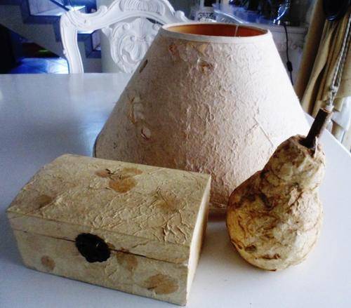 One bid takes all. A lovely large Lampshade measuring 38cm x 22cm done with cream/ivory coloured Leaf Relief. The Trinket Box measures 16cm x 10cm has a brass latch & hinges, lined in brown velvet. The Pear measures 16cm x 10cm. A lovely Trio for a special room.