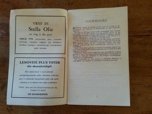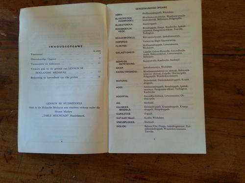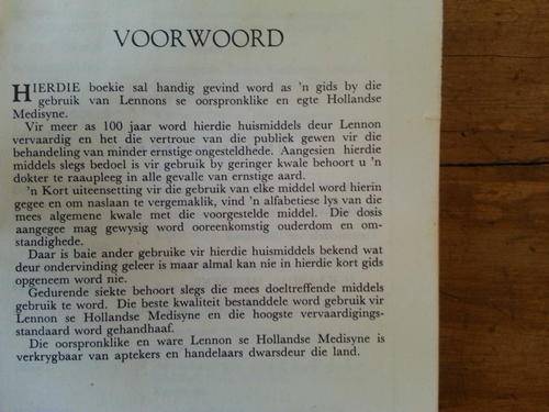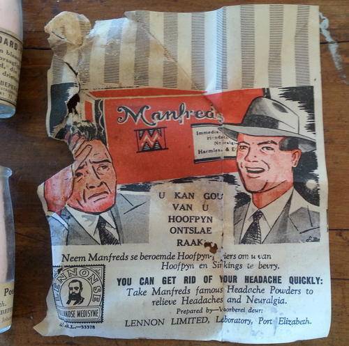 No medicine cabinet was complete without a good selection of Lennon's remedies to cure coughs, nerves, chills, backache, teething, etc etc. Offered here is a booklet in Afrikaans and English detailing each medicine and what it is to be used for as well as 2 glass bottles with cork stoppers with Bezoard powder. Each bottle was usually wrapped in a small pamphlet advertising one of their products, and one bottle still with this wrapping, the wrapping a bit frayed at one edge.