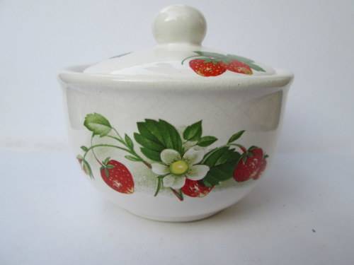 A lovely vintage lidded strawberry pattern jam pot, in good condition, 9.5 cm in diameter, 8 cm high.