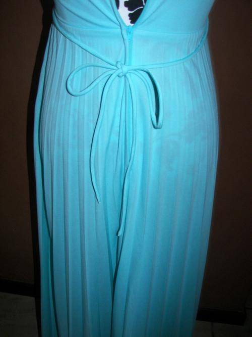 VINTAGE LONG PLEATED TURQUOISE BLUE DRESS WITH LACE INSERT AND SHOULDER OVERLAY "TREASURES" SIZE 34