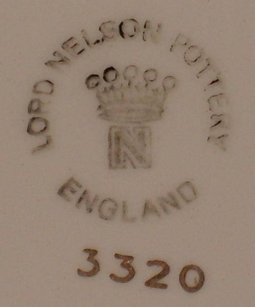 Stamped in black: Lord Nelson Pottery, England, Crown over N and number 3320 in gilt. Elijah