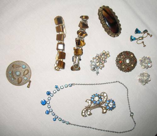 Ten items: 4 brooches with pins all working, 2 pairs of clip-on earrings, 1 pendant, 2 tigers-eye bracelets, 1 rhinestone necklace. All glass and metal, no plastic rubbish. All wearable as is: no missing stones or parts