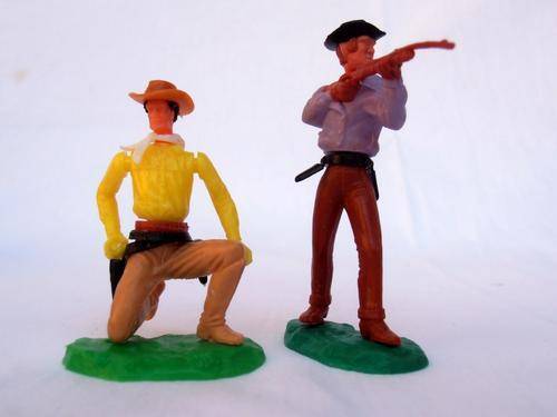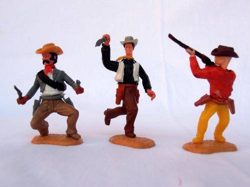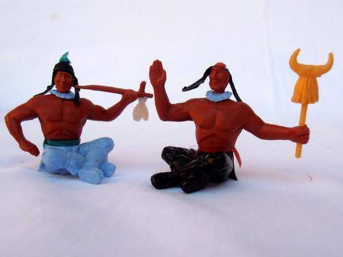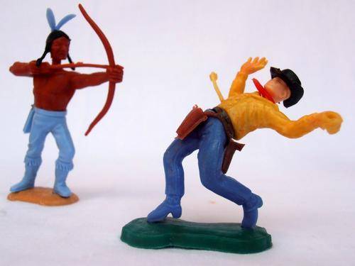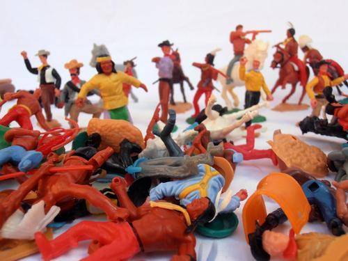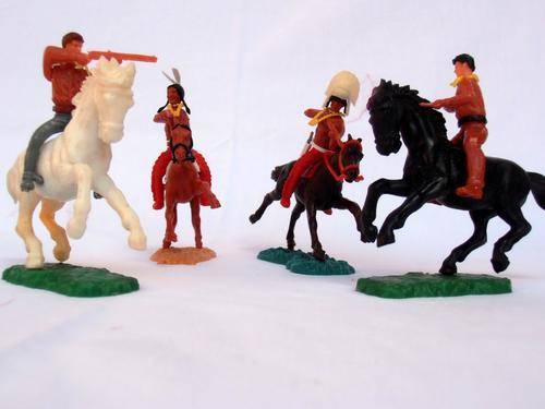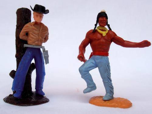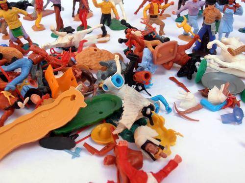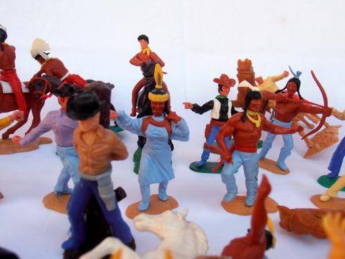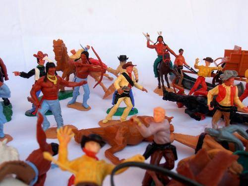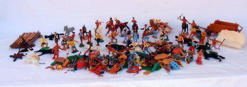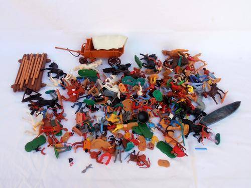 Up for auction is this huge lot of plastic cowboys and indians from the mid 1970's. This lot consists of hundreds of pieces of mainly three brands, Elastolin, Plasty and Timpo Toys. Many of the figures are in their original assembled state, many will need assembly and I will leave it up to you to fit them together again ;-) The one or the other piece might be missing by now, please don't be upset if you get left over with a pair of cowboy's legs and a tomahawk that don't match.......trust me, almost everything will fit together since I played with these until they got packed away 35 years ago. The size of the different figures is around 50 - 60 mm.