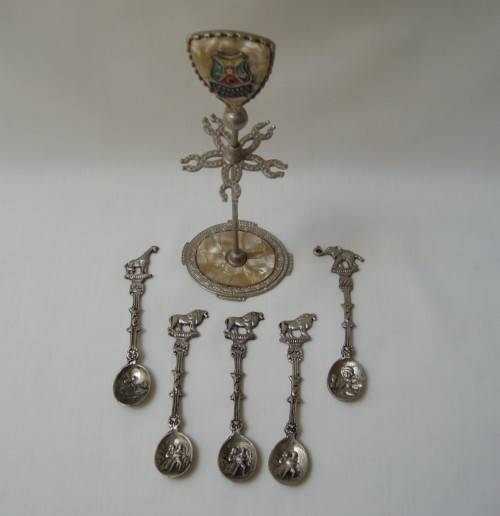 A silver-tone metal and mother-of-pearl formica spoon stand and five spelter spoons set, with