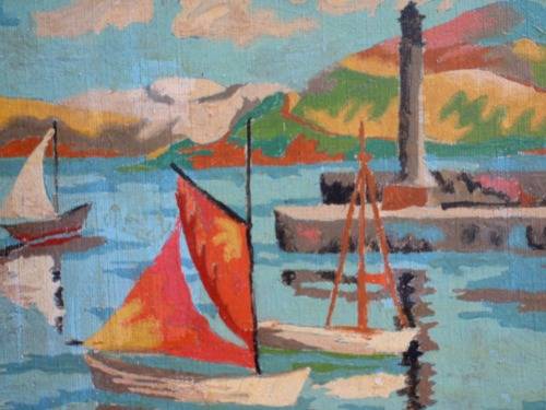 VINTAGE: CIRCA 1964 - GORGEOUS LITTLE NAUTICAL PAINTING (PAINT BY NUMBERS) OLD ENOUGH TO BE CUTE & COTTAGEY. FRAMED BEHIND GLASS IN NARROW NATURAL WOOD FRAME. SIZE: 27CM X 21CM (TOTAL SIZE INCLUDING FRAME OF 1CM IN WIDTH)
