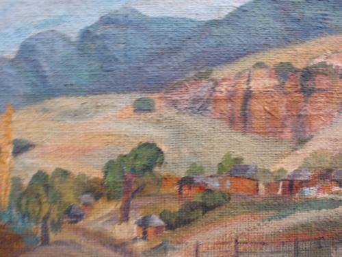 VINTAGE - LOVELY OLD ORIGINAL LANDSCAPE OF HILLS AND AFRICAN HUTS. THIS PAINTING IS OIL ON HESSIAN AND HAS A TEXTURED FINISH - VERY EFFECTIVE! SIZE: 64CM X 35CM.