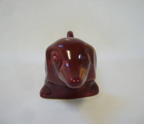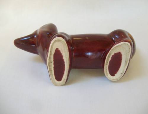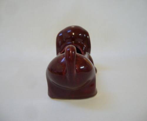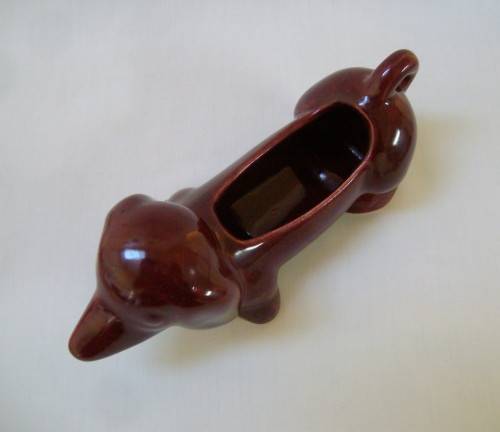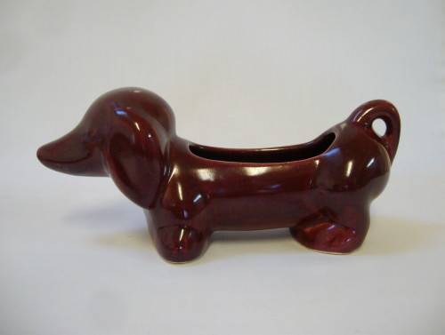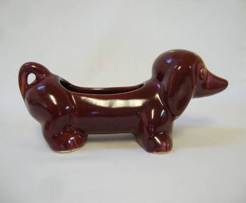 A burgundy maroon glazed porcelain trough vase, in the form of a sausage dog.