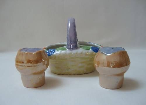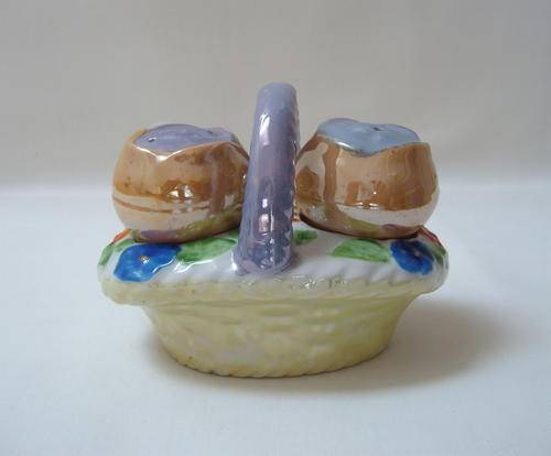 A set of white glazed porcelain salt and pepper shakers in the form flowers in a basket,