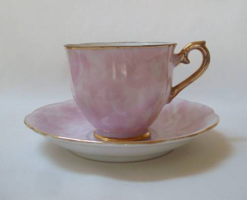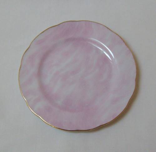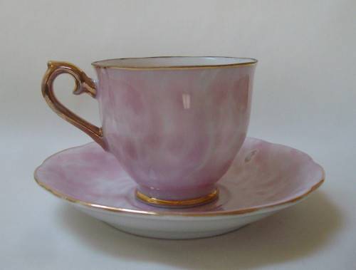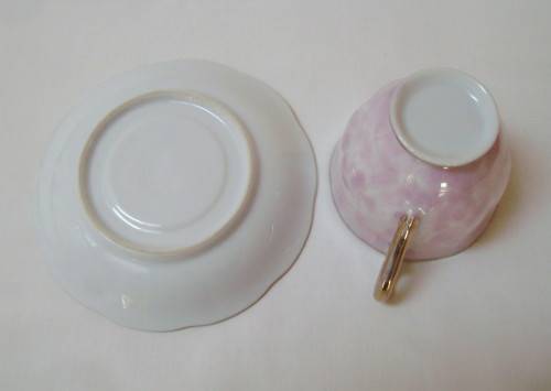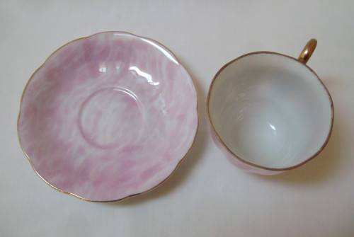 marbled pink ground in the Gossamer-style, gilt edged rims and ear detail.