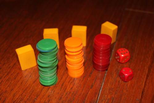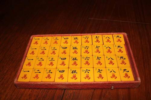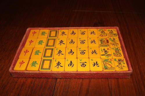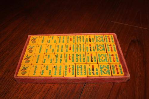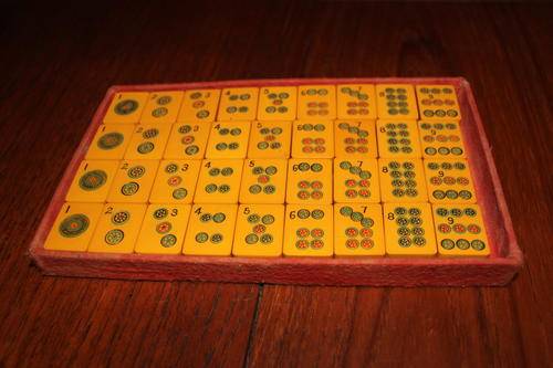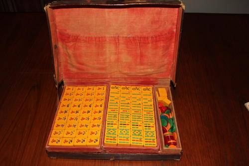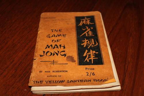 Mah-Jong set in original leather case. All tiles present, but dice are replacements. Leather case worn. Includes manual 'The Game of Mah Jong' written by Max Robertson, 4th edition.