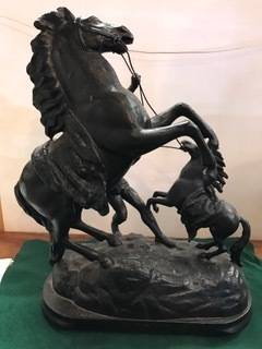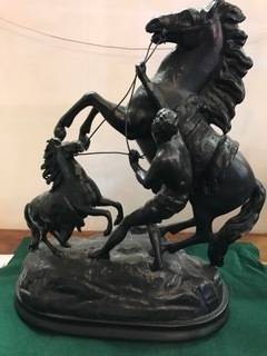 VERY RARE VINTAGE MAN AND -TWO HORSES- LARGE 340 mm x 400 mm HIGH SPELTER STATUE IN VERY GOOD CONDITION . THIS IS A VERY RARE STATUE WITH TWO HORSES ! EXCELLENT PRICE.