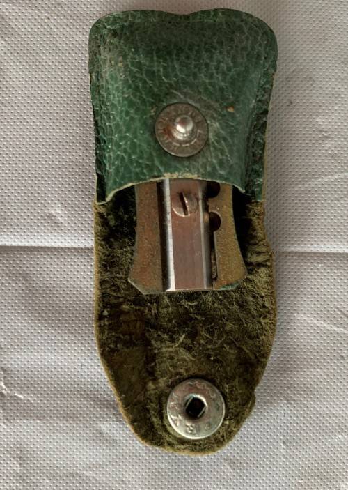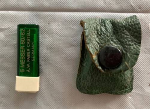ALSO A FABER-CASTELL SHARPENER IN IT'S GREEN LEATHER CASE WITH EXTRA BLADES