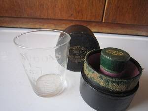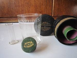 Lovely boxed vintage glass medicine measures, with original containers. this piece is really interesting and a must for the collector of medical items. In perfect condition except for one tiny nibble on the big glass. Size boxed 7cms high and 6cms long and wide.