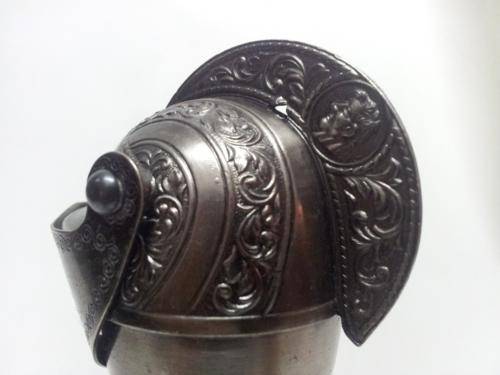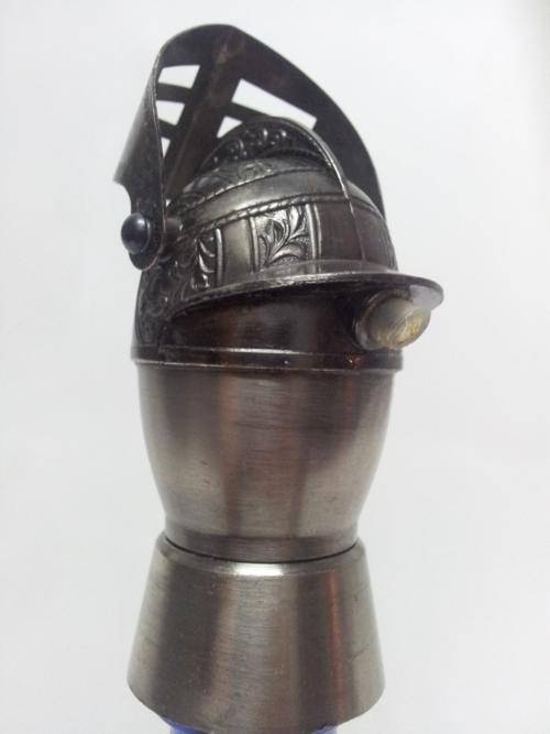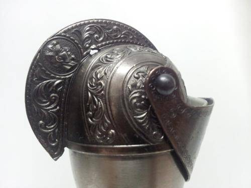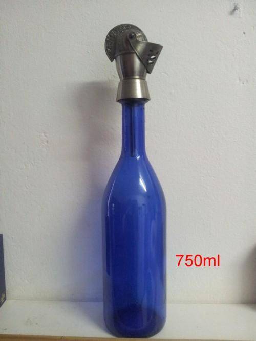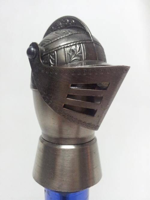 Cobalt blue wine bottles with vintage metal medieval knights helmet Pourers. This is a mini-replica of knight's helmet. Movable mask and very detailed. The age and maker of the bottle and pourer are unknown. The pourer’s cork in good shape and fit snugly on the bottle and is in working order. This is a very interesting set. The bottle alone is very beautiful, add the pourer and they really stand out, a really unique item for your bar.