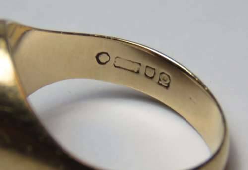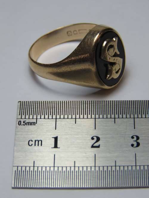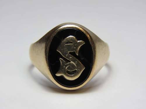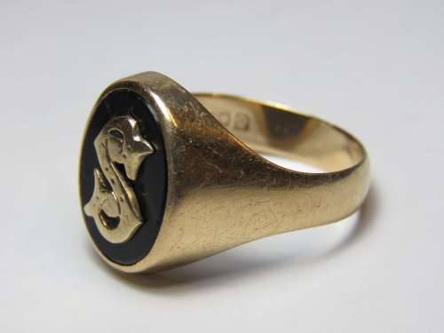 Vintage mens 9kt Gold and Onyx initial ring with letter S - Weighs 8.0 grams - Size between U and V