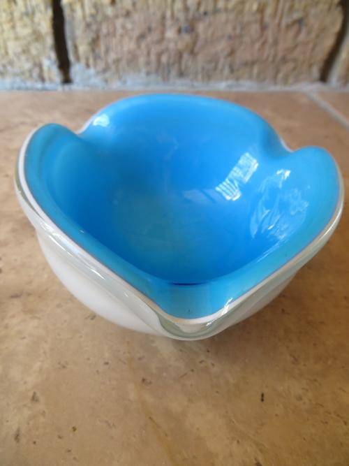 Lovely Murano Blue and white Cased Bowl Ashtray Candy Dish Vintage Antique Mid Century Home Décor Housewares Collectable.