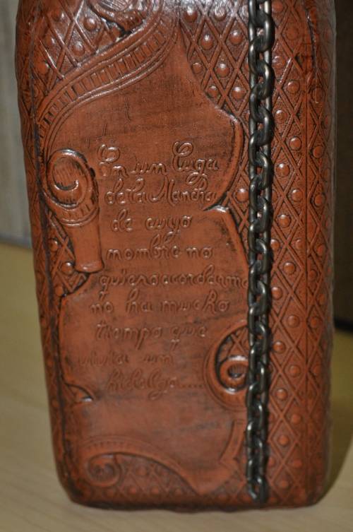 This stunning vintage decanter is made from glass and wrapped in embossed leather. It has a cap with a cork. The cap used to be connected to the bottle with the chain. The embossed leather features a portrait of the famous Spanish writer and poet Miguel de Cervantes, two scenes, and an excerpt from his work.